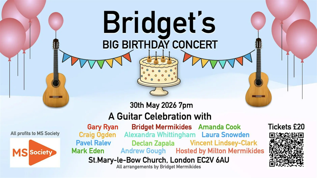 Classical guitar greats are coming together to celebrate Bridget’s 60th birthday by performing a selection of her arrangements for classical guitar. Performers include Bridget, Gary Ryan, Craig Ogden, Amanda Cook, Alexandra Whittingham, Vincent Lindsey-Clark, Pavel Ralev, Declan Zapala, Laura Snowden, Mark Eden and Andrew Gough. Hosted by Professor Milton Mermikides.