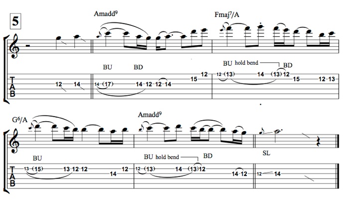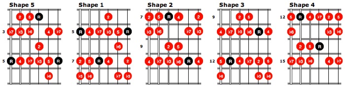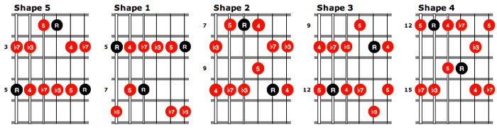 Using the key of A Aeolian (A B C D E F G), we will now link this mode to how we play the 5 positions of the A minor pentatonic scale (A C D E G). The notes of the minor pentatonic scale exist inside the Aeolian Mode and it can be helpful to see this clearly so firstly learn to play the 5 pentatonic shapes below. The ‘A’ root notes are black and other scale degrees are red with the scale degree number inside them. Fret numbers are indicated to the left of each diagram. Next, ‘pin’ the Aeolian scale patterns onto the pentatonic ones and practice them one by one.