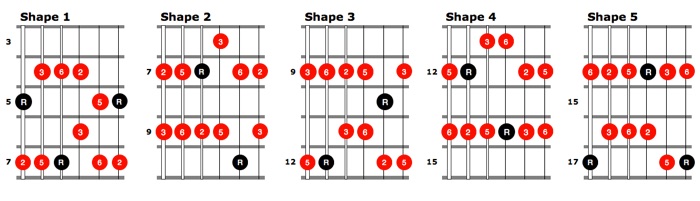 Using the key of A Lydian (A B C# D# E F# G#), we will now link this mode to how we play the 5 positions of the A major pentatonic scale (A B C# E F#). The notes of the major pentatonic scale exist inside the lydian Mode and it can be helpful to see this clearly so firstly learn to play the 5 pentatonic shapes below. The ‘A’ root notes are black and other scale degrees are red with the scale degree number inside them. Fret numbers are indicated to the left of each diagram. Next, ‘pin’ the Lydian scale patterns onto the pentatonic ones and practice them one by one.